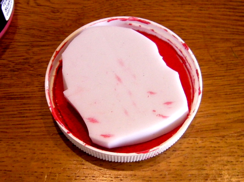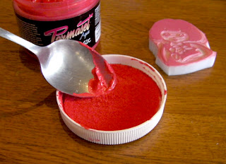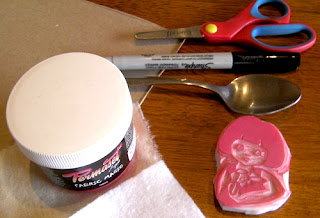 2. Spoon a small amount of paint into the fabric paint lid, spread around and then lay the felt over the top. Push the felt onto the paint with the back of the spoon until the paint starts coming through the felt. Add a little extra paint to top of the felt if need be but be careful not to overload with paint or the stamp will not give you a clean print.