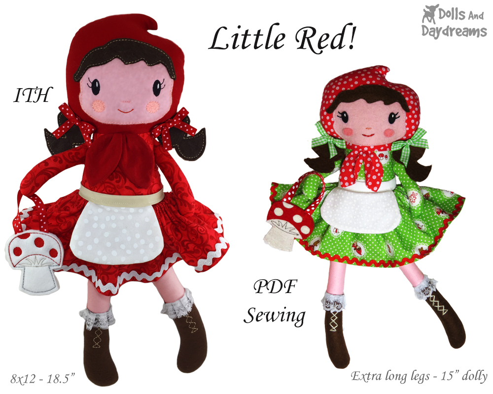 Meet Little Red, she comes in a Sewing PDF Pattern and and ITH Embroidery machine pattern! Hooray! She loves to play in the woods and will take your little ones on lots of adventures! With her removable Skirt, Apron and Mushroom handbag she will be the talk of Forest Fashion set! So fun, fast and easy to make you might keep one for yourself!